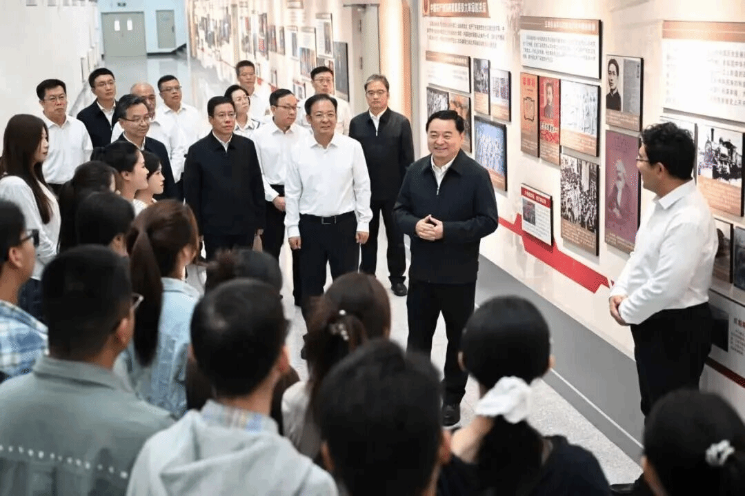 省委书记、省人大常委会主任郝鹏在辽宁石油化工大学历史文化教育基地,与正在上思政课的师生互动交流。